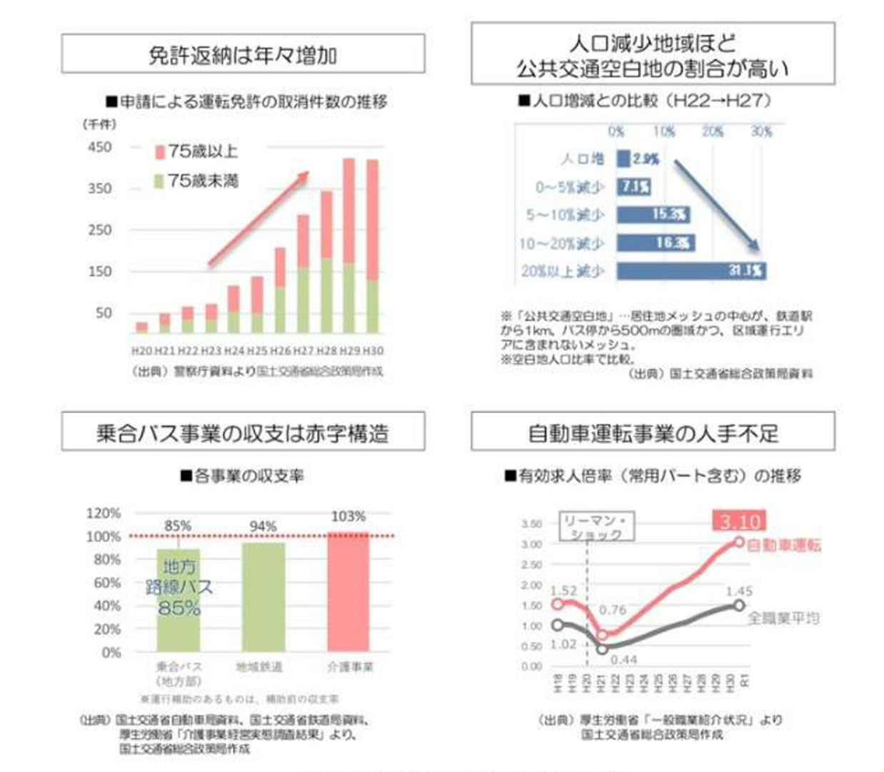 「移動」は地域の暮らしと産業を支え、豊かで暮らしやすい地域づくりや、個性・活力のある地域の振興を図る上で欠かせない存在です。しかしながら、近年の人口減少の本格化、高齢者の運転免許の返納の増加、運転手不足の深刻化、公共交通を確保・維持するための公的負担の増加等により、公共交通の維持は容易ではなくなってきています。