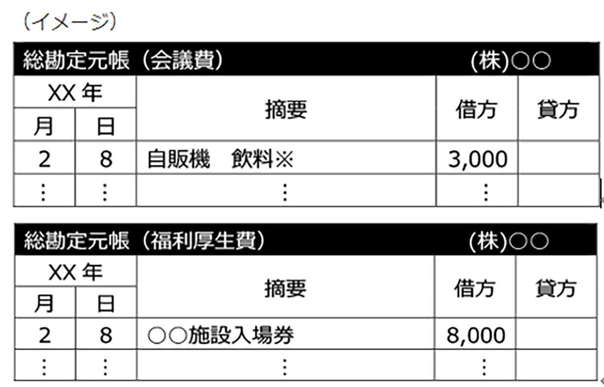 また、自動販売機で飲料を購入した際に、帳簿に記載する名称は、「自販機」と記載すればよいとした。帳簿の記載例として、「会議の際に提供する飲み物として、自動販売機で飲料(1本150円)を20本(3,000円)購入した場合」、「従業員の福利厚生目的で○○施設の入場券(1枚2,000円)を4枚(8,000円)購入し使用した場合」をそれぞれ以下のとおり示している。