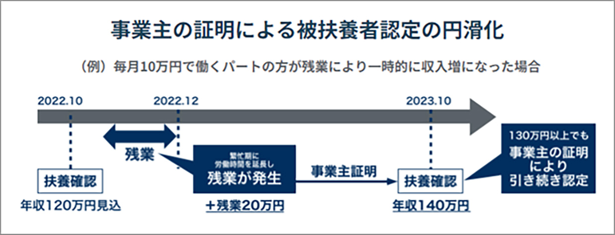 つまり、パート・アルバイトの方がご自身の職場から一時的に収入が増加した旨の証明をもらい、その配偶者の方が職場における被扶養者の収入の確認時に、その証明を提出すると被扶養者の認定を受けることができるというものになります。