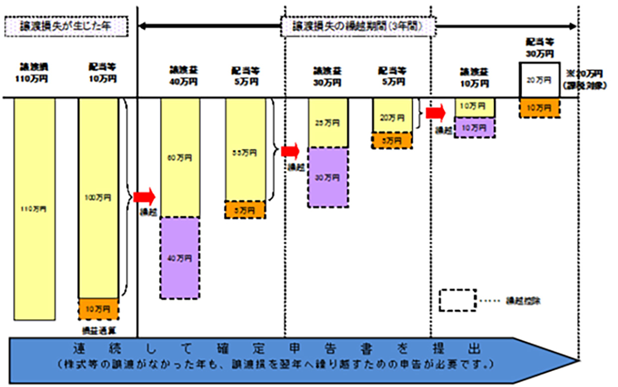 上場株式等を金融商品取引業者等を通じて譲渡したこと等により生じた譲渡損失の金額がある場合には、確定申告により、その年分の上場株式等の配当等に係る利子所得の金額及び配当所得の金額と損益通算ができる。また、損益通算してもなお控除しきれない損失の金額については、翌年以後3年間にわたり確定申告において上場株式等に係る方と所得等の金額及び上場株式等に係る配当所得等の金額から繰越控除することができます。