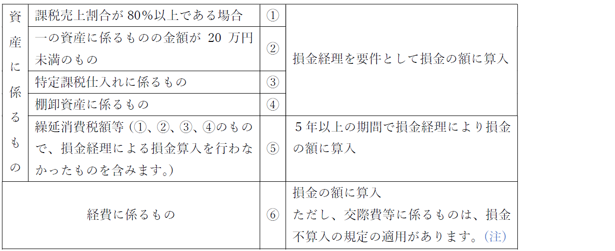 この控除対象外消費税額等のうち資産に係る控除対象外消費税額等については、これを「繰延消費税額等」として資産計上し、5年以上の期間で償却することとされていますが次の表のとおり、一定の要件に該当する控除対象外消費税額等については、一時の損金の額として経理することが認められます。