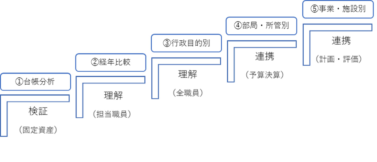 弊社におきましては、地方公会計の活用を踏まえた支援行っており、段階を踏んだ分析・活用事例をご紹介いたします。