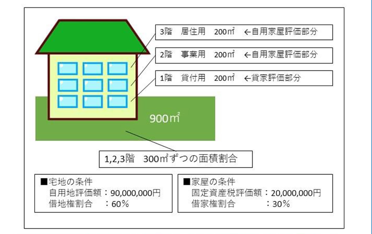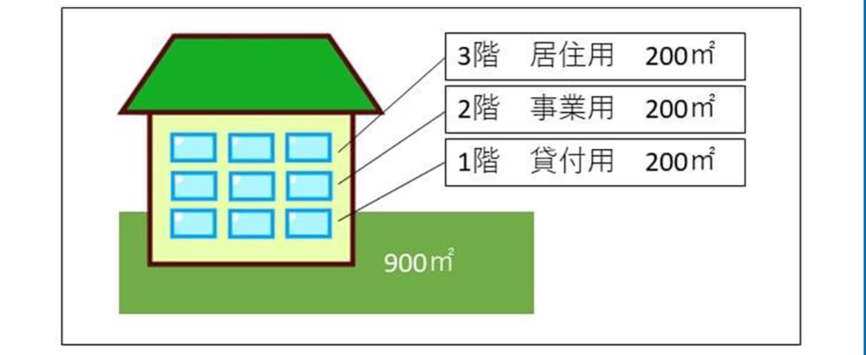 上図のように、通常であれば一つの評価単位とするような宅地の上に建物があり、その内部構成(階層毎、面積等)が自用地評価部分となる自己の居住用や事業用以外に、賃貸借契約に基づいている場合、その宅地については内部構成割合をもって自用地評価部分と貸家建付地評価部分に区分した合計額を評価額とします。