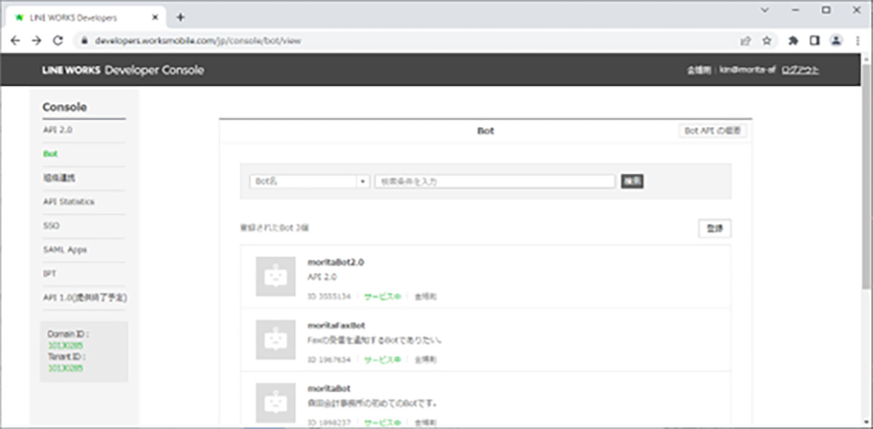 今回は、事務所でも積極的に使っていきたいと考えているのですが、LINE WORKSの機能の一つ、Botという機能を紹介させていただきます。これはメッセージ等をプログラムから送信したり、Botへメッセージを送信すると特定の処理を実行させたりする機能です。