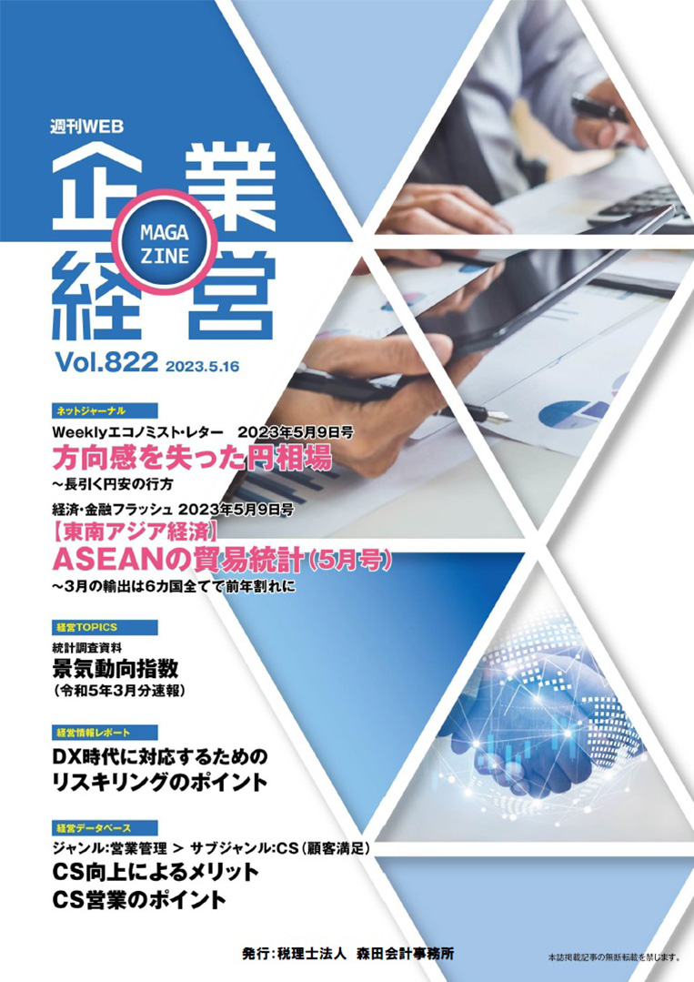 ネットジャーナル Weeklyエコノミスト・レター 2023年5月9日号方向感を失った円相場~長引く円安の行方 経済・金融フラッシュ 2023年5月9日号【東南アジア経済】ASEANの貿易統計(5月号)~3月の輸出は6カ […]