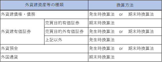 企業が事業年度終了時に保有する「外貨建資産等」の円換算額は、外貨建資産等の種類に応じて、発生時換算法、又は期末時換算法のいずれかの方法で換算した金額になります。